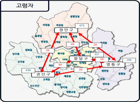 2015년 수원시 고령자 통행특성을 분석한 결과, 전체 2,189통행 중 수원시내 통행은 1,908통행(87.2%), 지역내 통행은 권선구 636통행(36.9%), 지역간 통행은 장안구와 팔달구, 권선구와 팔달구가 각각 44통행(24.0%)으로 나타났다.