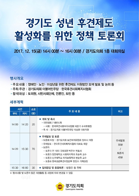 한편 15일에 개최되는“경기도 성년 후견제도 활성화를 위한 정책 토론회”좌장을 맡은 보건복지위원회 정희시 의원(민주, 군포1)은 “의사결정능력이 부족한 장애인, 노인치매 등의 어려움을 가진 경기도민이 자기결정을 보장 받고 인간다운 삶을 누릴 수 있도록 하는 지원할 수 있는 정책방안을 모색하고자 토론회를 마련했다”며, 토론회 개최 취지를 밝혔다.