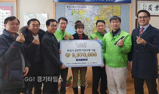 [경기타임스]화성시 장안면 ㈜노루오토코팅이 19일 장안면사무소에서 장안면지역사회보장협의체에 997만 원의 이웃돕기 성금을 기탁했다.