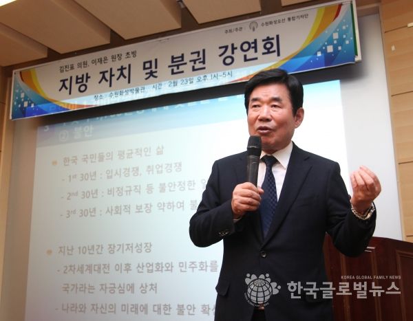 수원.화성.오산 통합기자단(회장 전철규, 경기타임스 대표)은 지난 23일 오후 ‘김진표 의원, 이재은 원장 초빙 지방 자치 및 분권 강연회’를 팔달구 소재 수원화성박물관 세미나실에서 개최했다. 이날 강연회는 최근 사회적 관심사로 떠오른 지방분권 개헌의 방향과 주요 쟁점에 대한 이해를 돕기 위해 마련했다.