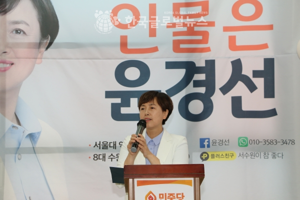 “윤경선 전 시의원과 함께 아파트 주민들을 위해 봉사해 왔어요. 일을 정말 꼼꼼히 합니다. 당보다 인물을 보고 뽑아 주십시오!”