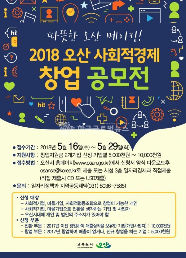 경기도 오산시는 지역의 문제를 해결하고 일자리를 창출하는 사회적경제 창업 지원을 위해 ‘2018 오산 사회적경제 창업 공모전’을 개최한다고 밝혔다.