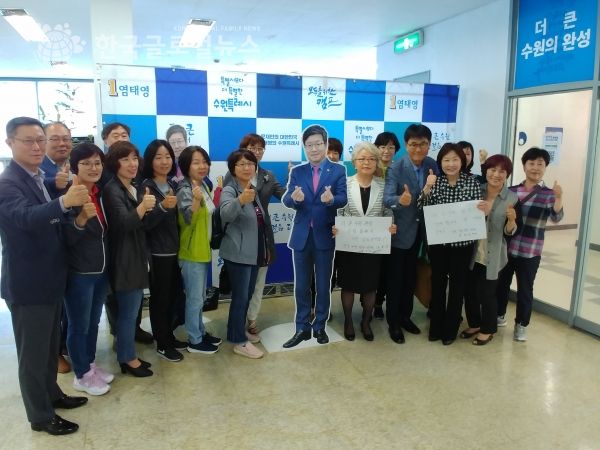 ‘승리 염원카드’에 정현숙 회장은 ‘더 큰 수원 완성! 기대합니다. 꼭! 이루어 주세요’라고, 오복자 이사는 ‘더 큰 수원 완성. 수원특례시. 3선 승리하세요!’라고 적었다.