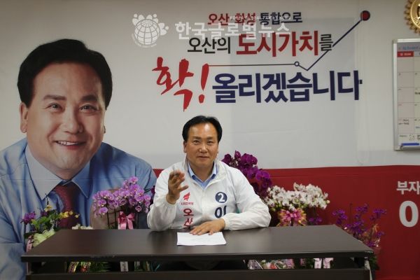 오산의 정체가 심각하다. 마땅히 있어야 할 것이 오산에는 없다. 이웃도시 화성과 평택은 하루가 다르게 눈부시게 발전하고 대기업 산업단지 유치하는데 오산은 아무런 변화가 없다. 시민들이 형편만 나아지면 오산을 떠나려고 한다. 도대체 4선 국회의원, 재선 시장이 한 일이 무엇인가? 변변한 기업을 유치했나? 꽉 막히는 교통문제를 해결했나? 말로는 교육도시 표방하고 있지만 좋은 대학 진학률은 너무 낮다. 실패했으면 능력이 검증된 거다. 새로운 인물로 바꿔야 한다. 이대로는 안된다. 우리 아이들을 위해 다음 세대를 위해 오산을 기회의 땅, 희망의 땅으로 만들어야 한다. 4년 동안 시장, 국회의원 선거에 나와 떨어졌지만 그 과정에서 열심히 지역발전을 위해 고민하고 준비해왔다. 준비된 정책, 좋은 정책을 가진 시장을 뽑아서 오산에 변화의 바람을 일으켜야 한다. 다른 도시보다 더 잘 사는 부자도시를 만들고 싶다.