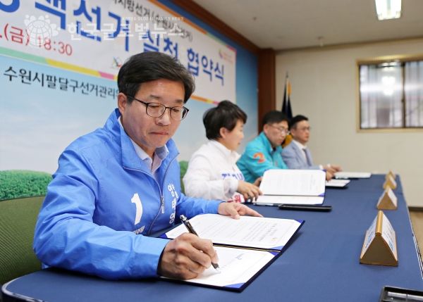 25일 오후 염태영 더불어민주당 수원시장 후보가 수원 팔달구선거관리위원회에서 열린 제7회 전국동시지방선거 매니페스토 정책선거 실천 협약식에 참석해 정책선거 실천서에 서명하고 있다.