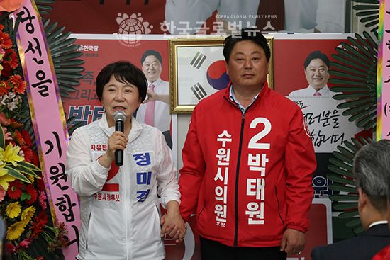 정미경 수원시장 후보를 비롯해 경기도의원 선거에 출마한 양민숙·한상춘 후보, 수원시의원 선거에 출마한 김경숙·유재광·한원찬·양은숙(비례) 후보 등도 함께 해 선거 승리를 다짐했다.