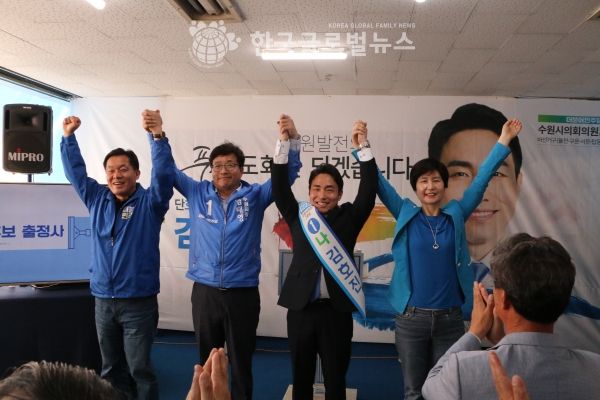김호진 더불어민주당 수원시의원 후보는 26일 오후 장안구 성균관대역 근처 선거사무소에서 개소식을 열고 필승을 다짐했다.