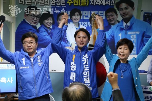 황대호 후보는 백혜련 의원, 염태영 수원시장 후보, 수원시 각 선거구에 출마한 경기도의원 후보, 수원시의원 후보들과 함께 두 손을 맞잡아 번쩍 들어올리며 필승의 각오를 다졌다.
