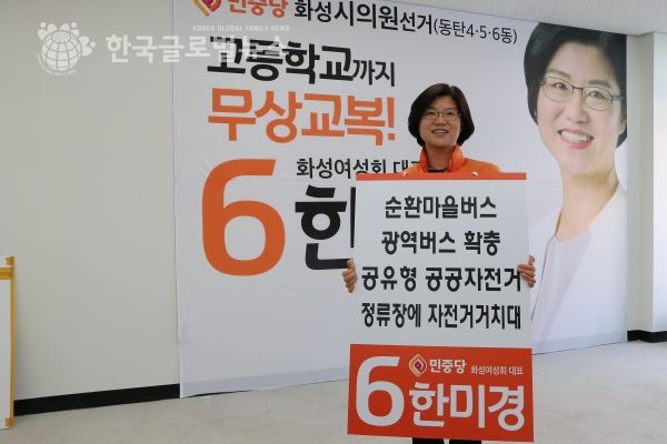한 후보는 3등까지 뽑는 동탄4·5·6동에서 출마했다. 화성여성회 대표 등을 맡고 있다. 화성시주민참여예산위원회 위원장, 화성시 교육경비 보조금 심의위원회 위원 등을 맡은 바 있다.