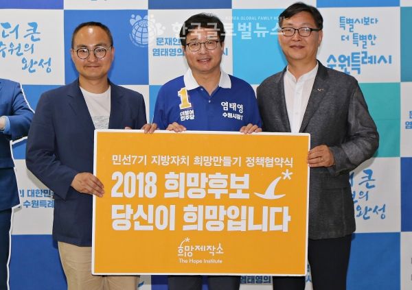 염태영 더불어민주당 수원시장 후보는 시민사회 싱크탱크인 (재)희망제작소(소장:김제선)와 ‘희망만들기 정책협약’을 체결했다고 1일 밝혔다.