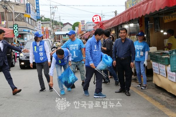 이날 염 후보는 연무시장 상인들과 장을 보러나온 지역주민들에게 단순히 인사나 하는 선거운동이 아니라, 연무시장 골목을 청소용 집게와 쓰레기봉투를 들고 청소하는 선거운동을 했다.