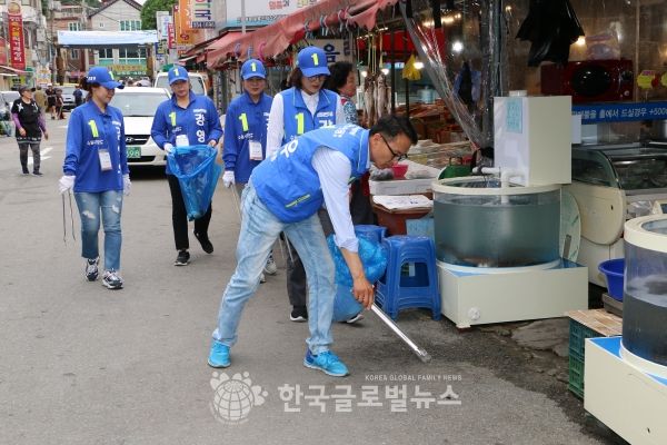 강 후보는 청소용 집게와 쓰레기봉투를 들고 연무시장 골목골목을 누비며 청소하는 선거운동을 했다.