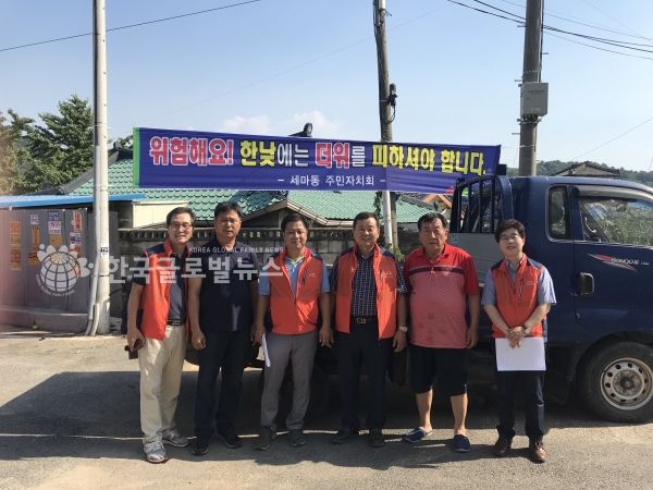 특히 한 낮 기온이 38도를 웃도는 지난 8월의 첫날에는 지구 온난화와 이상기후로 인해 111년만의 혹서기를 맞아 열사병은 물론 고혈압과 당뇨 등 성인병을 앓고 있는 어르신들이 폭염에 노출되어 위험한 상황에 놓이고 심할 경우 사망에 이를 수 있다는 소식을 접한 정찬성 주민자치회장을 비롯한 세마동 8개 단체장들과 지난달부임한 김성복 세마동장의 첫 행보가 분주해졌다.