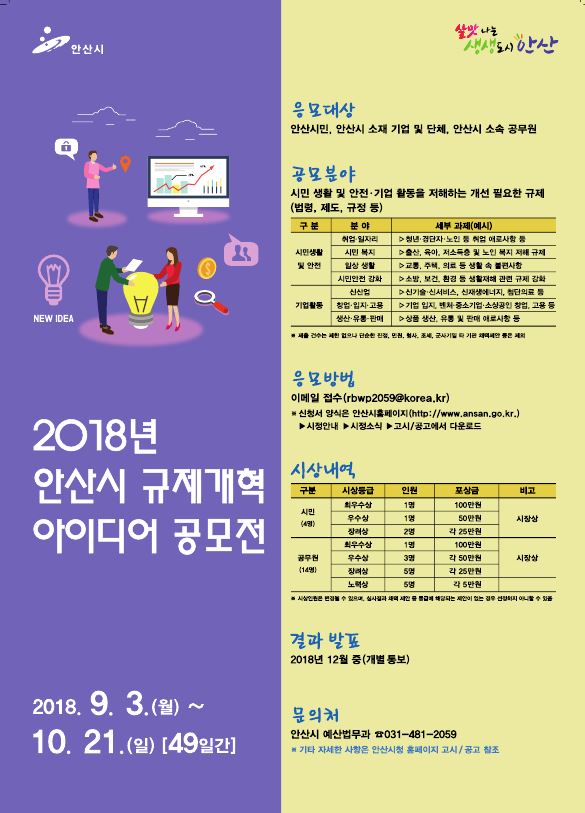 안산시(시장 윤화섭)는 시민의 일상생활 및 기업 활동에 불편을 주는 불합리한 행정규제 등을 적극 발굴·개선하기 위해 ‘2018년 안산시 규제개혁 공모전’을 개최한다.