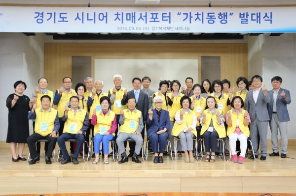 경기도와 경기복지재단 노인일자리지원센터는 5일 재단 세미나실에서 2018 신규 노인일자리 시범사업인 ‘시니어 치매서포터-가치동행’ 발대식을 개최했다.
