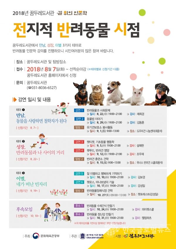 반려동물 인문학은 문화체육관광부 주최, 한국도서관협회가 주관하는 “길 위의 인문학”사업으로, 2018년 꿈두레도서관이 공모사업에 선정되어 “전지적 반려동물 시점”타이틀로 반려동물 관련하여 다양한 특강을 진행하고 있다.