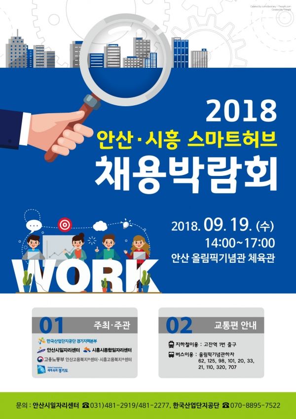 일자리 미스매칭 해소를 위해 일자리 유관기관이 공동으로 협업해 진행하는 ‘2018 안산·시흥 스마트허브 채용 박람회’는 스마트 허브 단지 내 우량 기업 50여개가 참여하며, 경기도와 안산시, 시흥시, 안산고용복지+센터, 시흥고용복지+센터, 한국산업단지공단 경기지역본부가 함께한다.