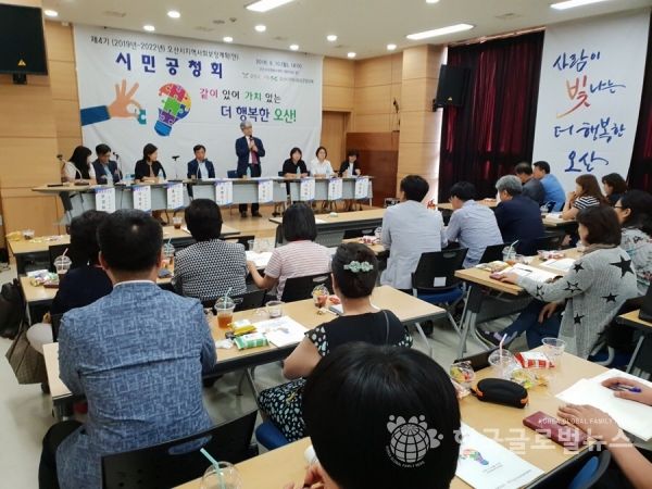 오산시(시장 곽상욱)와 오산시지역사회보장협의체(이상주 공동위원장)는 지난 10일 오산시자원봉사센터 1층 대강의실에서 시민, 사회복지 관련 기관?단체?종사자 및 협의체 위원, 공무원 등 150여명이 참석한 가운데 제4기 오산시 지역사회보장계획(안) 수립(공공단장 어수자 국장, 민간단장 김정훈 교수)을 위한 시민공청회를 개최했다.