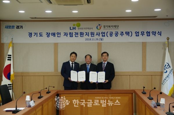 경기복지재단은 26일 경기도장애인복지종합지원센터에서 LH경기지역본부와 ‘장애인 자립전환지원사업(공공주택) 업무협약’을 체결하고, 장애인들의 자립 및 안정적인 지역사회 정착을 위해 함께 노력해 나가기로 했다.