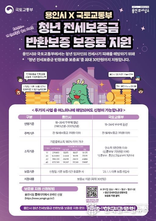 (한국글로벌뉴스 - 박소연 기자) 용인특례시는 국토교통부가 청년 전세보증금 반환보증 보증료 지원사업을 추진함에 따라 시 사업과 병행해 사업을 확대한다고 27일 밝혔다.