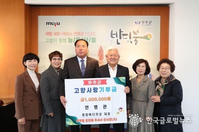 (한국글로벌뉴스 - 박소연 기자) 지난 23일 부안군 청정바다젓갈 안병관 대표가 무주군에 고향사랑 기부금 1백만 원을 기탁했다.