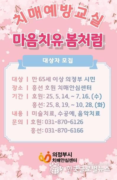 (한국글로벌뉴스 - 박소연 기자) 의정부시 보건소는 시 치매안심센터가 문화체육관광부와 한국문화예술교육진흥원이 주관하는 ‘2025 문화로 치유 지원사업’ 공모에 참여해 협력시설로 2년 연속 선정됐다고 밝혔다.
