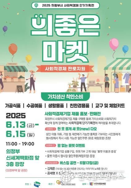 (한국글로벌뉴스 - 박소연 기자) 의정부시는 시민들과 함께하는 사회적경제 단기기획전 ‘의좋은마켓’을 6월 13일부터 15일, 매일 오전 11시부터 오후 7시까지 신세계백화점 3층 야외광장(의정부역사 앞)에서 개최한다.
