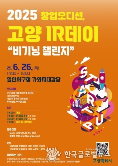 (한국글로벌뉴스 - 박종욱 기자) 고양특례시는 오는 26일 일산서구청 가와지 대강당에서 창업오디션‘2025년 상반기 고양 아이알(IR)데이’를 개최한다고 밝혔다.