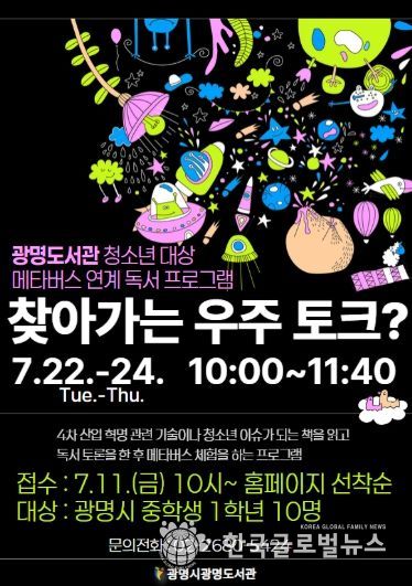 (한국글로벌뉴스 - 박소연 기자) 광명시 광명도서관이 오는 11일 오전 10시부터 메타버스 기반 독서토론 프로그램 ‘찾아가는 우주토크?’에 참여할 청소년을 모집한다.