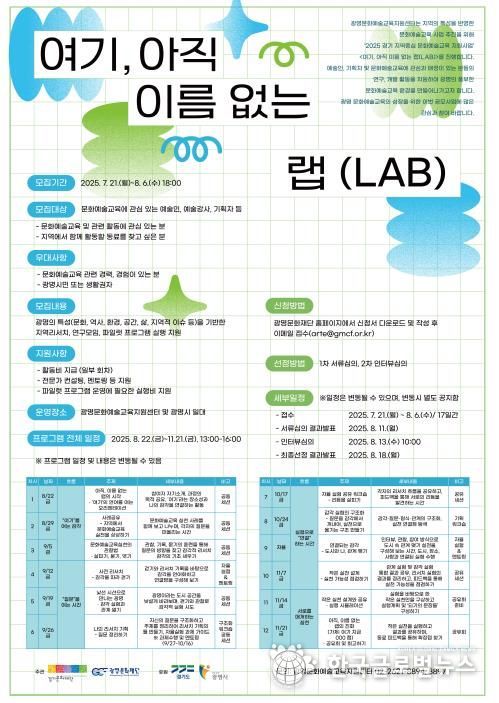 (한국글로벌뉴스 - 박소연 기자) (재)광명문화재단은 지역중심 문화예술교육 지원사업의 일환으로 추진되는‘여기, 아직 이름 없는 랩(LAB)’의 참여자를 7월 21일부터 8월 6일까지 모집한다. 모집 인원은 총 12명 내외이며, 문화예술교육에 관심 있는 예술인, 예술강사, 기획자 누구나 지원 가능하다.
