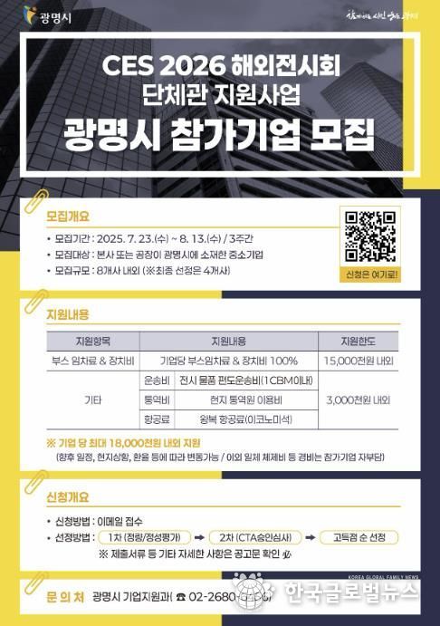 (한국글로벌뉴스 - 박소연 기자) 광명시는 2026년 1월 미국 라스베이거스에서 개최되는 국제전자제품박람회(CES 2026)에 참가를 원하는 기업을 오는 8월 13일까지 모집한다.