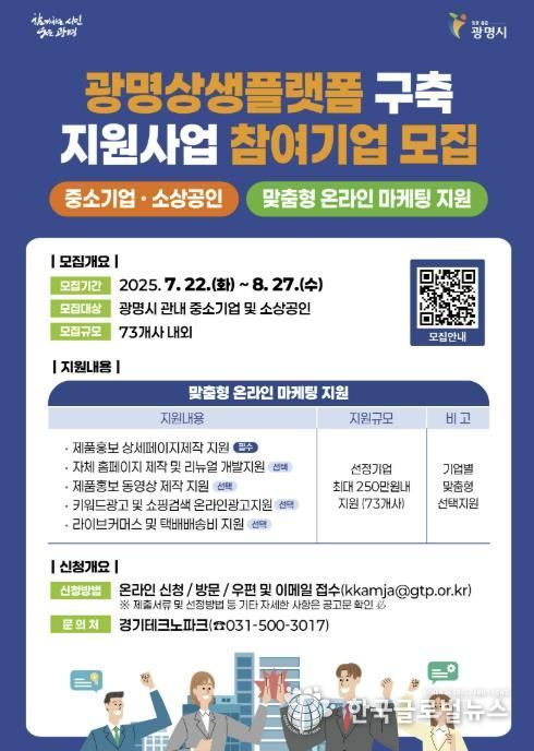 (한국글로벌뉴스 - 박소연 기자) 광명시는 오는 8월 27일까지 ‘광명상생플랫폼’에 입점해 온라인 마케팅을 확대하고자 하는 73개 중소기업·소상공인을 모집한다.