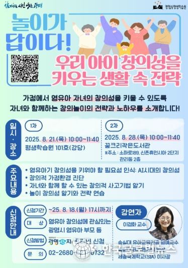 (한국글로벌뉴스 - 박소연 기자) 광명시 평생학습원은 오는 29일부터 ‘놀이가 답이다! 우리 아이 창의성을 키우는 생활 속 전략’ 프로그램 학습자 100여 명을 모집한다.