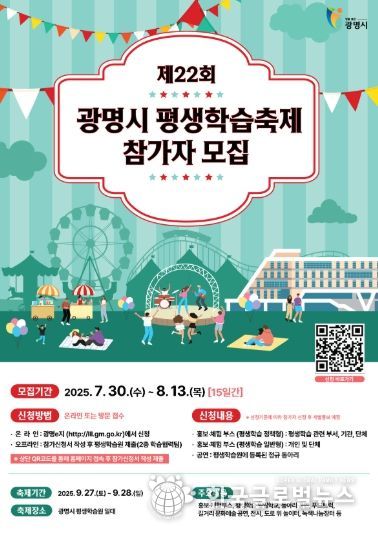 (한국글로벌뉴스 - 박소연 기자) 광명시는 오는 30일부터 8월 13일까지 ‘제22회 광명시 평생학습축제’에 참여할 기관, 단체, 동아리 등 참가자를 모집한다.