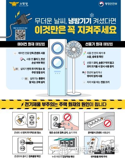여름철 전기화재 예방을 위한 안전 수칙으로는 ▲에어컨 전용 콘센트 사용 ▲작동 전 플러그 및 전선 손상 여부 확인 ▲선풍기 사용 전 먼지 제거 ▲콘센트 내 먼지 주기적 청소 ▲젖은 손으로 접촉 금지 등이 있으며 문어발식 콘센트 사용은 반드시 피해야 한다. 누전차단기가 정상 작동하는지 수시로 점검하고 반려동물이 전선을 물거나 훼손하지 않도록 관리하는 것 역시 중요한 예방법이다.