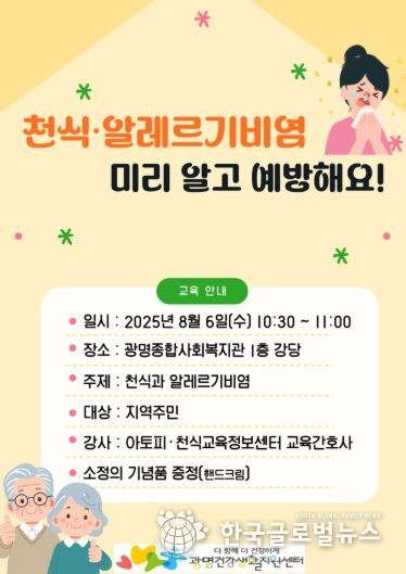 (한국글로벌뉴스 - 박소연 기자) 광명시 보건소는 오는 6일 광명종합사회복지관에서 ‘지역주민과 함께하는 천식·알레르기비염 예방 교육’을 실시한다.