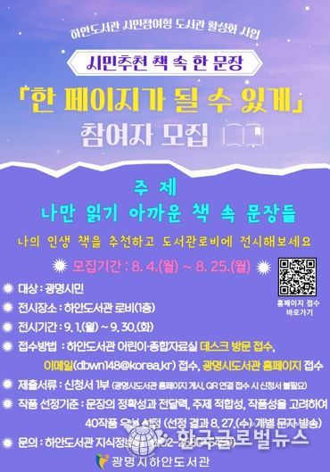 (한국글로벌뉴스 - 박소연 기자) 광명시 하안도서관은 오는 4일부터 25일까지 시민이 직접 추천한 책 속 한 문장을 전시하는 ‘한 페이지가 될 수 있게’ 참여자를 모집한다.