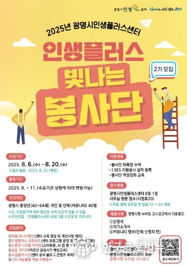 (한국글로벌뉴스 - 박소연 기자) 광명시 인생플러스센터는 오는 6일부터 20일까지 중장년 세대의 전문성과 경험을 지역사회에 환원하는 ‘2025년 인생플러스 빛나는 봉사단’ 2기에 참여할 봉사자 40명을 모집한다.