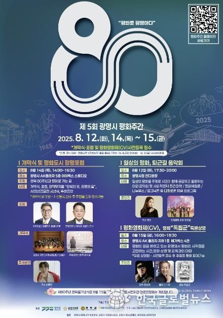 (한국글로벌뉴스 - 박소연 기자) 광명시가 광복 80주년을 맞아 역사적 의미를 되새기고 일상 속 평화의 가치를 돌아보는 ‘제5회 광명시 평화주간’ 행사를 진행한다.