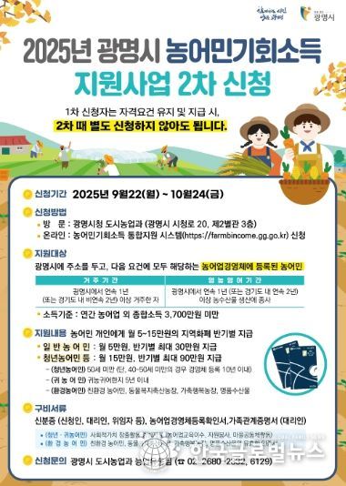 (한국글로벌뉴스 - 박소연 기자) 광명시는 오는 22일부터 10월 24일까지 ‘2025년 2차 농어민 기회소득 지원사업’ 신청을 받는다.
