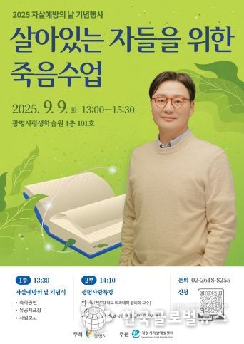 (한국글로벌뉴스 - 박소연 기자) 광명시 자살예방센터는 오는 9일 광명시평생학습원에서 ‘2025년 자살예방의 날’을 맞아 ‘살아있는 자들을 위한 죽음수업’ 특강을 연다.