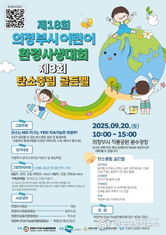 (한국글로벌뉴스 - 박소연 기자) 의정부시는 9월 20일 오후 1시 직동공원 분수광장(정보도서관 뒤편)에서 5~13세 어린이를 대상으로 ‘제3회 탄소중립 골든벨 퀴즈대회’를 개최한다.