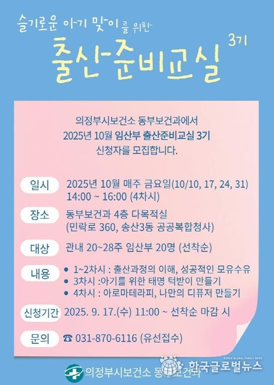 (한국글로벌뉴스 - 박소연 기자) 의정부시 보건소 동부보건과는 관내 20~28주 임산부를 대상으로 ‘임산부 출산준비교실’ 프로그램 3기 대상자 20명을 9월 17일부터 선착순 모집한다.