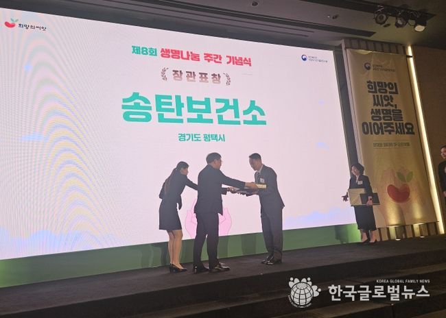 (한국글로벌뉴스 - 박소연 기자) 평택시 송탄보건소는 지난 9월 8일 서울 엘타워에서 열린 제8회 생명나눔 주간 기념행사에서 장기기증 활성화에 기여한 공로를 인정받아 보건 복지부 장관 표창을 수상했다.