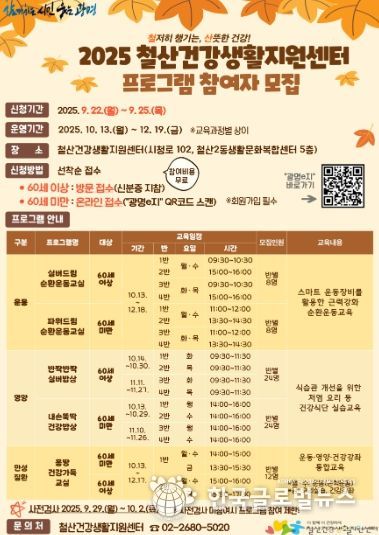 참가 신청은 연령에 따라 구분한다. 60세 미만은 광명시 평생학습 통합 플랫폼 ‘광명e지’(sugang.gm.go.kr)에서 온라인으로만 신청할 수 있으며, 회원가입이 필요하다. 60세 이상은 모집 기간 내 철산건강생활지원센터를 직접 방문해 광명시민 여부와 본인 확인을 위한 신분증을 제시하면 된다.
