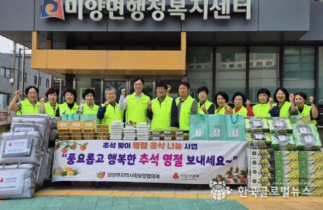 (한국글로벌뉴스 - 박소연 기자) 미양면 지역사회보장협의체는 지난 30일 추석을 맞이 하여 돌봄이 필요한 저소득 독거 어르신 50가구에 모듬전 및 제철 과일 등 명절 음식 나눔 행사를 실시했다.