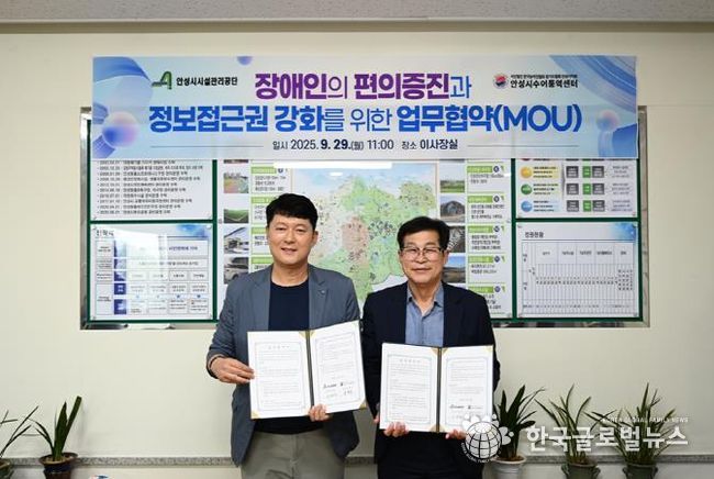 (한국글로벌뉴스 - 박소연 기자) 안성시시설관리공단은 지난 29일 오전11시 공단 2층 이사장실에서 안성시수어통역센터와 안성시 공영주차장을 이용하는 장애인의 편의증진과 정보접근권 보장을 위한 업무협약을 체결했다.