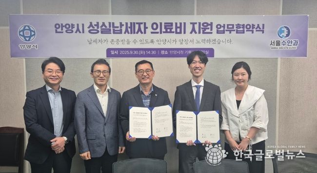 (한국글로벌뉴스 - 박소연 기자) 안양시는 지난달 30일 오후 2시30분 3층 기획경제실장실에서 관내 의원인 서울수안과와 ‘성실납세자 의료비 지원’ 업무협약을 체결했다고 1일 밝혔다.