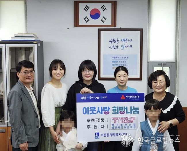 (한국글로벌뉴스 - 박소연 기자) 수원시 권선구 서둔동에 위치한 백조어린이집 및 예쁜백조어린이집은 지난 2일, 지역사회 내 어려운 이웃과 소외계층을 위해 어린이집 체험활동 수익금 1,154,000원을 서둔동행정복지센터에 기부했다.