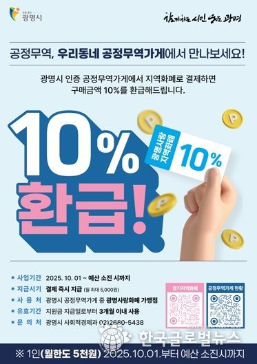 (한국글로벌뉴스 - 박소연 기자) 광명시가 공정무역가게에서 광명사랑화폐(지역화폐)로 결제하면 결제금액의 10%를 돌려주는 ‘공정무역 실천 캐시백’ 행사를 진행한다고 9일 밝혔다.